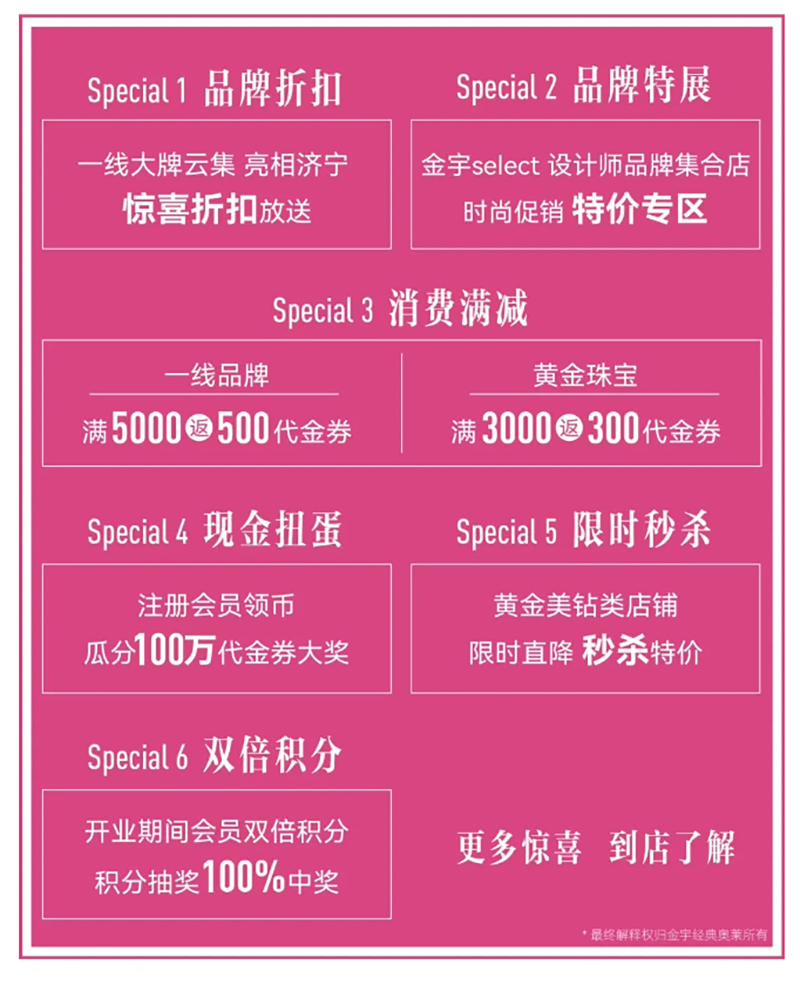 隨著金宇經(jīng)典奧萊的開業(yè),濟(jì)寧國(guó)際生活節(jié)正式拉開序幕。以回饋濟(jì)寧人為目的,制造濟(jì)寧人自己的時(shí)尚地盤,4.29-5.30盛惠不止狂歡不停,覆蓋五一黃金周,推出大量?jī)?yōu)惠活動(dòng),時(shí)尚秀場(chǎng)、live演出、驚喜折扣、雙倍積分、現(xiàn)金扭蛋等,回饋廣大市民朋友!