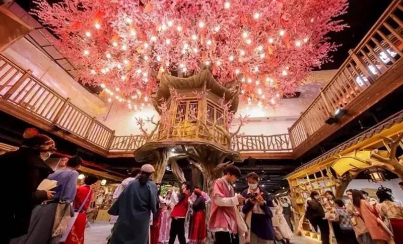 位于北京東三環(huán)富力廣場5層的大型沉浸式主題商業(yè)空間“戲精桃花源”,占地面積400多平方米,以桃花源為場景主題,在室內(nèi)打造了一個(gè)沉浸式娛樂休閑空間,將沉浸式場景、劇情演員、故事游戲、入駐店鋪,通過游戲串聯(lián)起來,消費(fèi)者可以在真人NPC的互動(dòng)和幫助下完成任務(wù),在游逛的同時(shí)還完成了游戲體驗(yàn)。