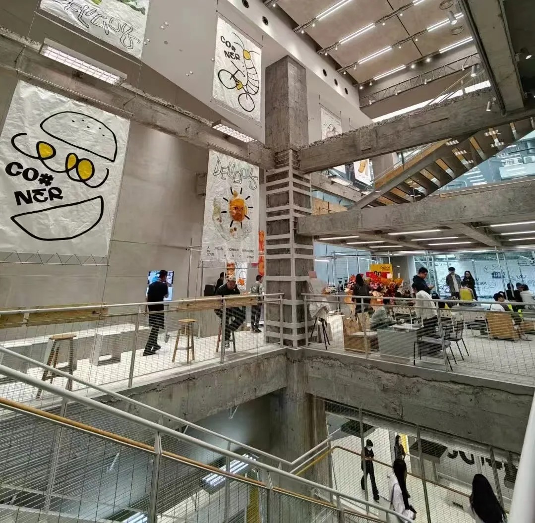 COSMO成都全新創(chuàng)意社區(qū)食堂成功開放,水泥工業(yè)風(fēng)加上暖色桌椅相結(jié)合,還有可愛的簡(jiǎn)筆畫呼應(yīng),反差非常吸睛。干凈簡(jiǎn)潔的包豪斯風(fēng)格高級(jí)感拉滿。用美食社交理念打造出青年的食堂,主打“碰頭吃飯,食為了玩”。