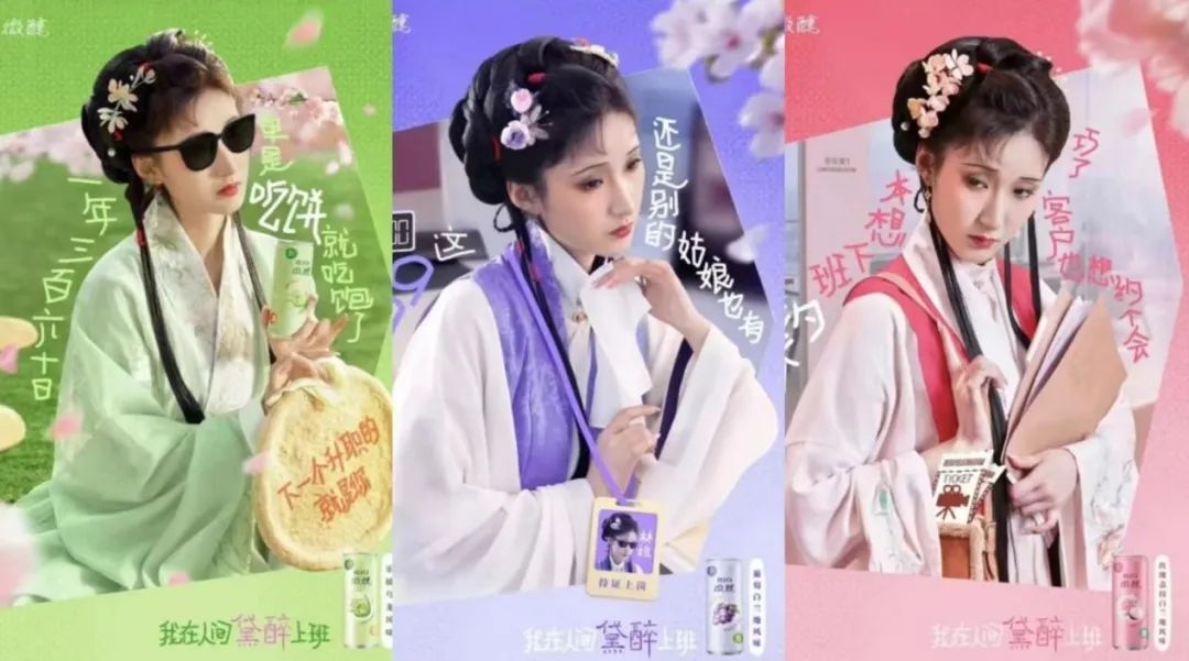 比如在五一調(diào)休這個社會熱點話題中,RIO雞尾酒請出了大IP林黛玉,推出一組“我在人間黛醉上班”的海報,每一句都非常“有那味兒”。這組海報以林黛玉的形象為核心,將她的古典韻味與現(xiàn)代職場生活巧妙融合,每一幅都充滿了獨特的韻味與深意。