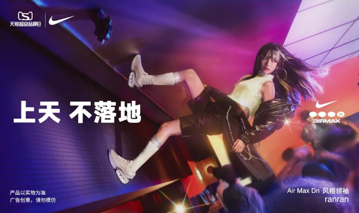 提及“發(fā)瘋”,耐克的「上天不落地」營銷大事件也是不得不提一提的。借助新發(fā)布系列的契機,耐克與天貓超級品牌日牽手,通過與潮流人群共創(chuàng),借助城市文化加強對潮流藝術(shù)的表達,深度溝通年輕人群,在社交平臺上號召網(wǎng)友們玩轉(zhuǎn)“先瘋”穿搭共創(chuàng)。