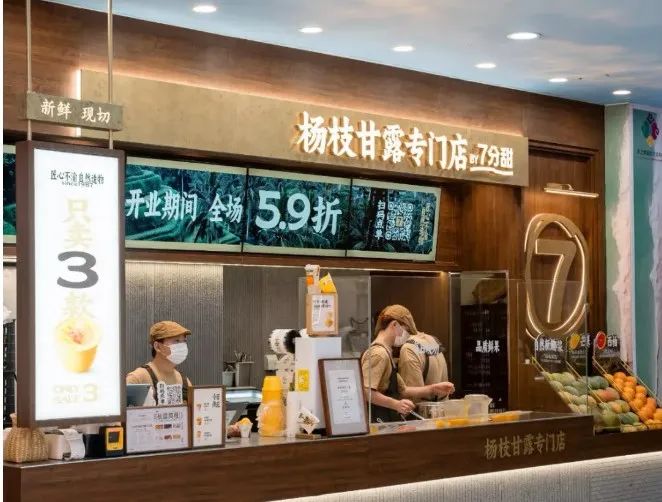 去年,七分甜的首家楊枝甘露專門店在上海長寧龍之夢開業(yè),在產(chǎn)品方面,專門店僅售三款產(chǎn)品,分別是1987經(jīng)典楊枝甘露、2007鮮芒楊枝甘露、楊枝甘露Gelato,分為碗裝、杯裝和冰淇淋,定價(jià)在15-20元。在店型方面,走小店模式,不設(shè)堂食。專門店面積大約只有20平方米左右,目前僅支持下單后排隊(duì)自取。在裝修風(fēng)格上,店內(nèi)裝修以原木配色為主,主打簡約風(fēng)。在鮮果陳列區(qū)擺放了制作楊枝甘露所需要的椰子、芒果、西柚等原料,采用明檔吧臺在顧客面前現(xiàn)切現(xiàn)做,讓消費(fèi)者直觀感受產(chǎn)品的制作流程。